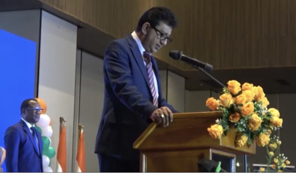 In Guyana, Attorney General and Minister of Legal Affairs Anil Nandlall represented President Irfaan Ali who was traveling in England. Foreign Minister Hugh Todd was also in attendance on stage. They joined the High Commissioner Dr Amit Telang and his wife in a toast. The celebrations were held on the afternoon of the reading of the budget in Guyana’s national assembly, and as a result other members of the parliament and cabinet ministers could not attend the reception. Mr. Nandlall and Mr. Todd represented the President who was traveling in England. Nandlall read remarks from the government of Guyana saluting India on the occasion. As the AG noted, this joyous occasion celebrates India’s inspiring journey and reflects the close bonds and shared values between our two nations. He stressed the strengthening of relations between the two countries.